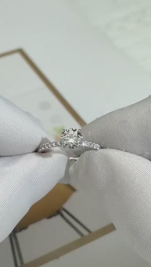 A timeless symbol of elegance, this pavé engagement ring features a round brilliant centre diamond set on a half-eternity band. Crafted in 18 carat gold, the band is adorned with finely set pavé diamonds that add radiant sparkle without overpowering the centre stone. A classic and refined choice, perfect for those who love understated luxury and lasting beauty.